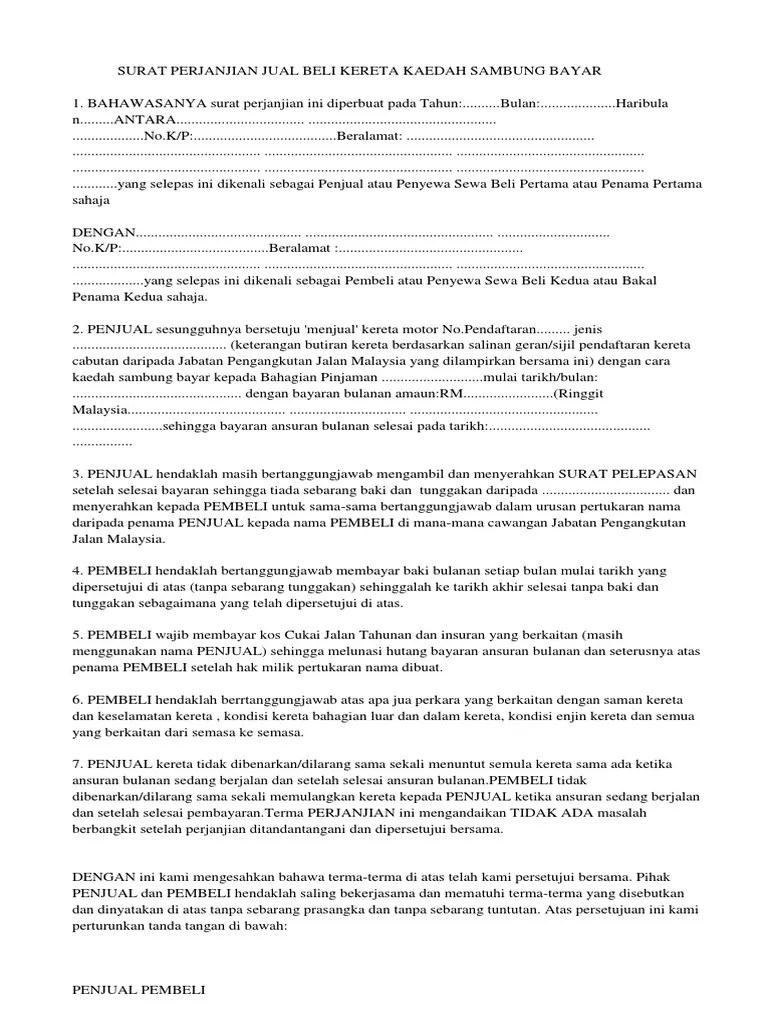 Surat perjanjian jual beli kereta kaedah sambung bayar. Namun, jika anda ada kenalan yang tak mampu bayar ansuran bulanan kereta tersebut, anda boleh menjual atau membeli kereta tersebut dengan syarat . Surat perjanjian jual beli kereta sambung bayar · 1. Doc surat perjanjian jual beli kereta kaedah sambung bayar . Bahawasanya surat perjanjian ini diperbuat pada tahun:.bulan:. Surat perjanjian jual beli kereta kaedah sambung bayar.